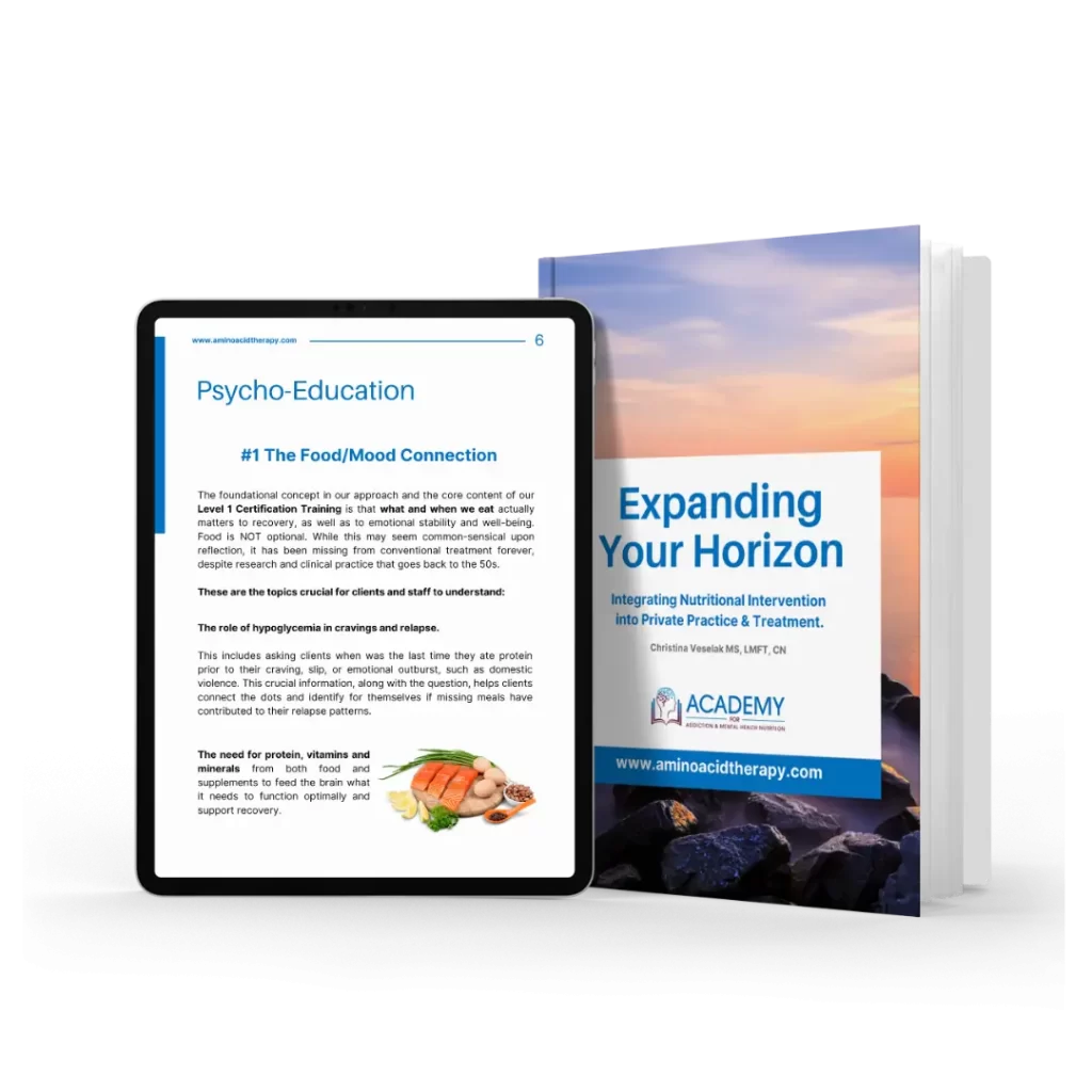 For a more comprehensive strategy and roadmap for integrating nutritional intervention into your practice or program, check out our eBook, Expanding Your Horizon: Integrating Nutritional Intervention into Mental Health & Addiction Practice & Treatment. This resource will guide you through the process and help you effectively implement these interventions.